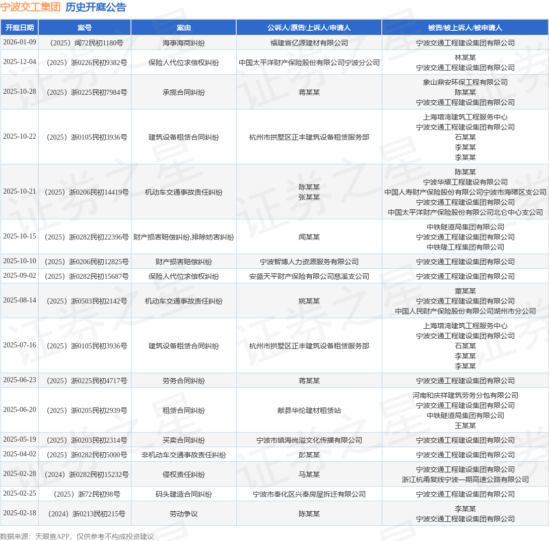 案号:(2025)浙0226民初9382号根据统计,近一年内以宁波交通工程建设集团有限公司为当事人的历史开庭公告有17则,其中案由为“保险人代位求偿权纠纷”的公告以2则居首,其次为“建筑设备租赁合同纠纷”有2则,“机动车交通事故责任纠纷”有2则。历史开庭公告如下: