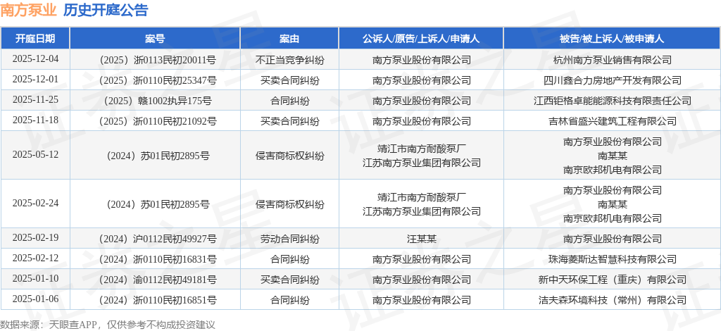根据统计,近一年内以南方泵业股份有限公司为当事人的历史开庭公告有10则,其中案由为“买卖合同纠纷”的公告以3则居首,其次为“合同纠纷”有3则,“侵害商标权纠纷”有2则。历史开庭公告如下: