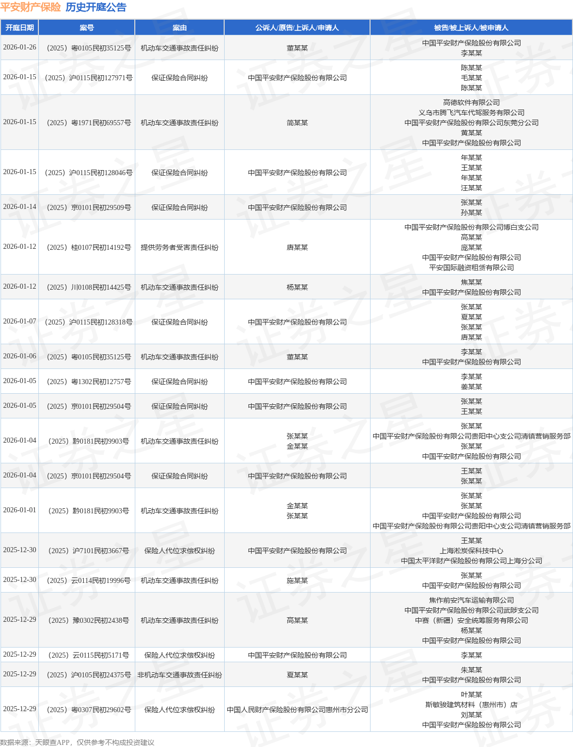 案号:(2025)沪0115民初128506号根据统计,近一年内以中国平安财产保险股份有限公司为当事人的历史开庭公告有2185则,其中案由为“机动车交通事故责任纠纷”的公告以1060则居首,其次为“保证保险合同纠纷”有273则,“保险人代位求偿权纠纷”有180则。历史开庭公告(前20条)如下: