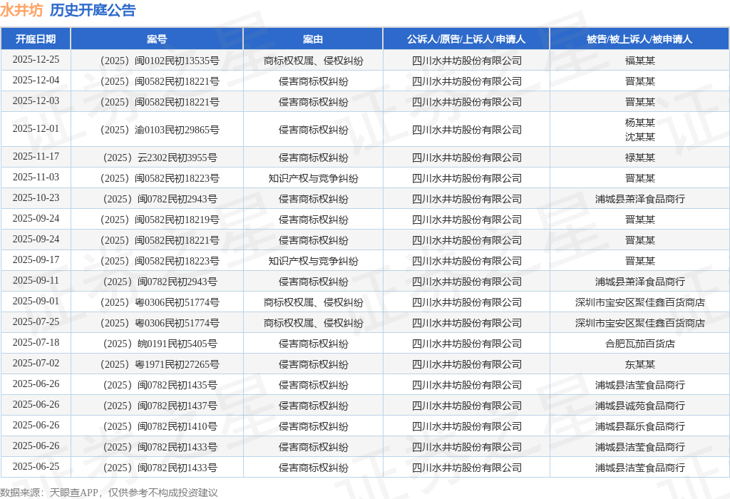 案号:(2025)闽0582民初18221号根据统计,近一年内以四川水井坊股份有限公司为当事人的历史开庭公告有31则,其中案由为“侵害商标权纠纷”的公告以24则居首,其次为“商标权权属、侵权纠纷”有4则,“知识产权与竞争纠纷”有2则。历史开庭公告(前20条)如下: