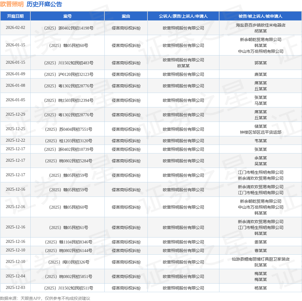 案号:(2025)皖0802民初5851号根据统计,近一年内以欧普照明股份有限公司为当事人的历史开庭公告有551则,其中案由为“侵害商标权纠纷”的公告以470则居首,其次为“侵害商标权”有24则,“商标权权属、侵权纠纷”有16则。历史开庭公告(前20条)如下: