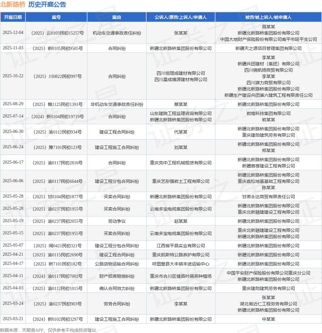 案号:(2025)云0103民初15257号根据统计,近一年内以新疆北新路桥集团股份有限公司为当事人的历史开庭公告有45则,其中案由为“建设工程施工合同纠纷”的公告以8则居首,其次为“建设工程合同纠纷”有6则,“买卖合同纠纷”有5则。历史开庭公告(前20条)如下:
