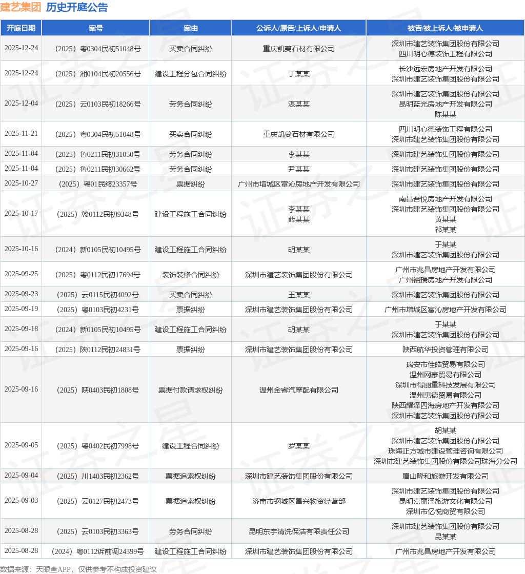 案号:(2025)云0103民初18266号根据统计,近一年内以深圳市建艺装饰集团股份有限公司为当事人的历史开庭公告有144则,其中案由为“装饰装修合同纠纷”的公告以27则居首,其次为“票据纠纷”有25则,“建设工程施工合同纠纷”有23则。历史开庭公告(前20条)如下: