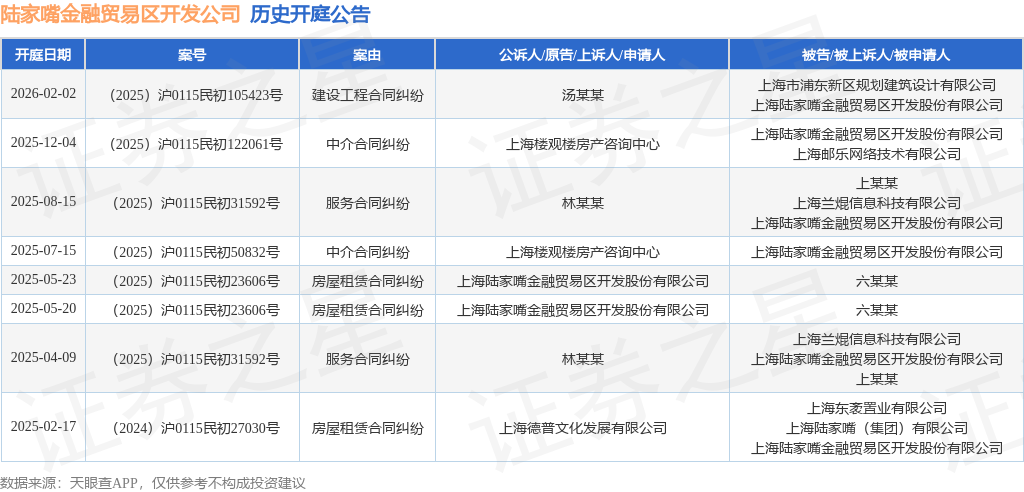 案号:(2025)沪0115民初122061号根据统计,近一年内以上海陆家嘴金融贸易区开发股份有限公司为当事人的历史开庭公告有8则,其中案由为“房屋租赁合同纠纷”的公告以3则居首,其次为“中介合同纠纷”有2则,“服务合同纠纷”有2则。历史开庭公告如下: