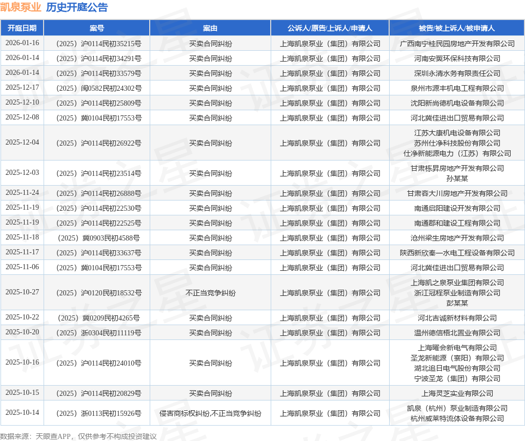 案号:(2025)沪0114民初26922号根据统计,近一年内以上海凯泉泵业(集团)有限公司为当事人的历史开庭公告有241则,其中案由为“买卖合同纠纷”的公告以197则居首,其次为“合同纠纷”有7则,“分期付款买卖合同纠纷”有7则。历史开庭公告(前20条)如下: