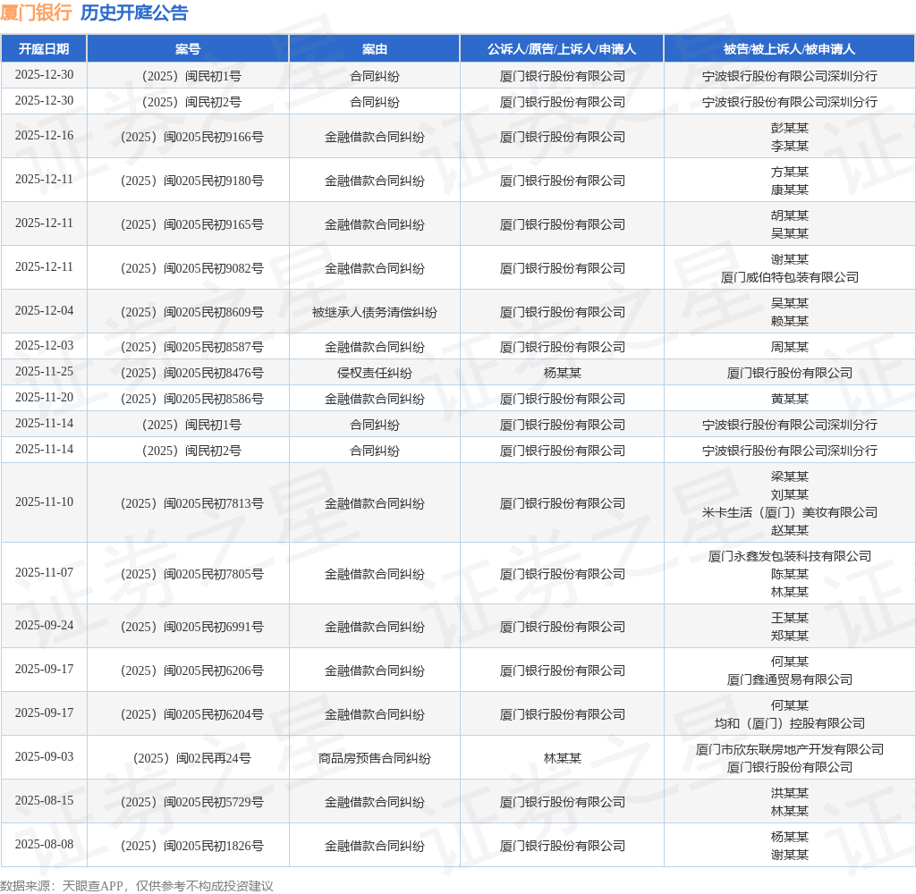 案号:(2025)闽0205民初8587号根据统计,近一年内以厦门银行股份有限公司为当事人的历史开庭公告有82则,其中案由为“金融借款合同纠纷”的公告以58则居首,其次为“申请确认仲裁协议效力”有6则,“合同纠纷”有4则。历史开庭公告(前20条)如下: