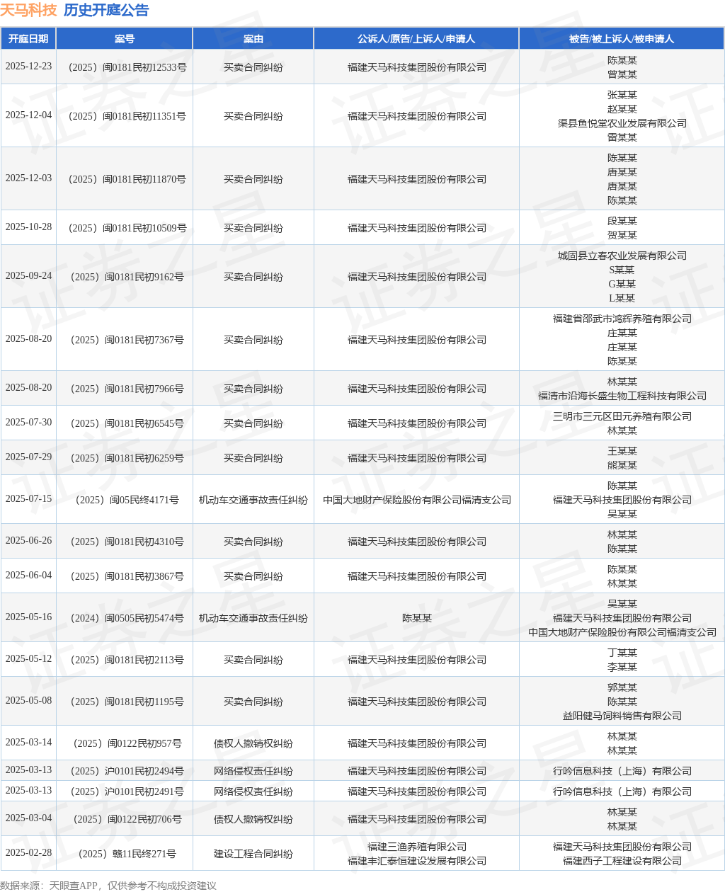 案号:(2025)闽0181民初11351号根据统计,近一年内以福建天马科技集团股份有限公司为当事人的历史开庭公告有24则,其中案由为“买卖合同纠纷”的公告以14则居首,其次为“机动车交通事故责任纠纷”有4则,“债权人撤销权纠纷”有2则。历史开庭公告(前20条)如下: