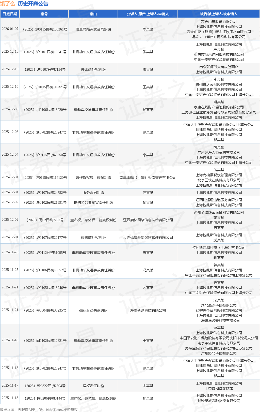 案号:(2025)沪0115民初45250号根据统计,近一年内以上海拉扎斯信息科技有限公司为当事人的历史开庭公告有400则,其中案由为“非机动车交通事故责任纠纷”的公告以224则居首,其次为“机动车交通事故责任纠纷”有46则,“侵害商标权纠纷”有43则。历史开庭公告(前20条)如下: