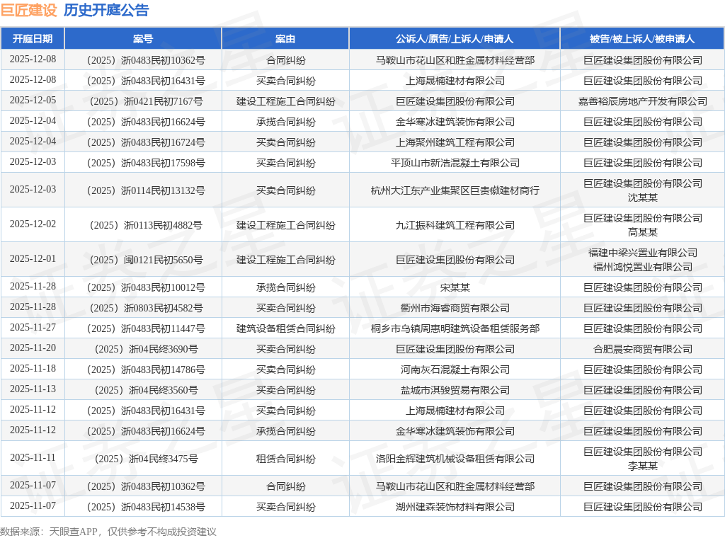 案号:(2025)浙0483民初16724号根据统计,近一年内以巨匠建设集团股份有限公司为当事人的历史开庭公告有234则,其中案由为“买卖合同纠纷”的公告以80则居首,其次为“合同纠纷”有36则,“建设工程施工合同纠纷”有30则。历史开庭公告(前20条)如下:
