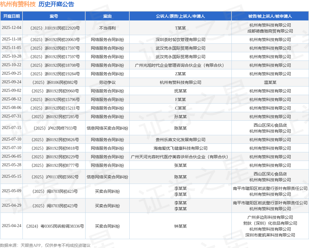 案号:(2025)川0191民初22920号根据统计,近一年内以杭州有赞科技有限公司为当事人的历史开庭公告有31则,其中案由为“网络服务合同纠纷”的公告以21则居首,其次为“买卖合同纠纷”有3则,“信息网络买卖合同纠纷”有3则。历史开庭公告(前20条)如下: