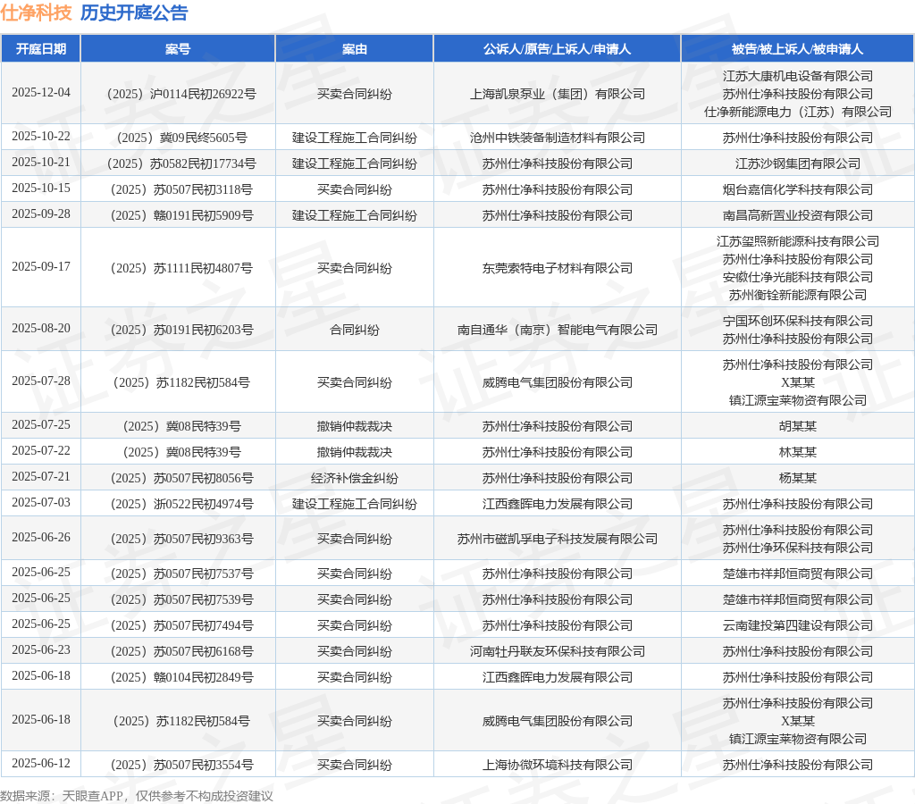 案号:(2025)沪0114民初26922号根据统计,近一年内以苏州仕净科技股份有限公司为当事人的历史开庭公告有60则,其中案由为“买卖合同纠纷”的公告以30则居首,其次为“分期付款买卖合同纠纷”有6则,“合同纠纷”有6则。历史开庭公告(前20条)如下: