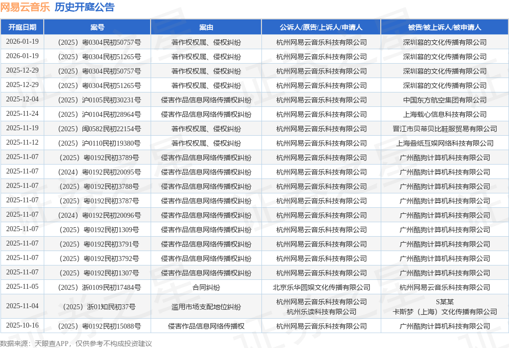 案号:(2025)沪0105民初30231号根据统计,近一年内以杭州网易云音乐科技有限公司为当事人的历史开庭公告有133则,其中案由为“侵害作品信息网络传播权纠纷”的公告以66则居首,其次为“著作权权属、侵权纠纷”有16则,“侵害作品信息网络传播权”有15则。历史开庭公告(前20条)如下: