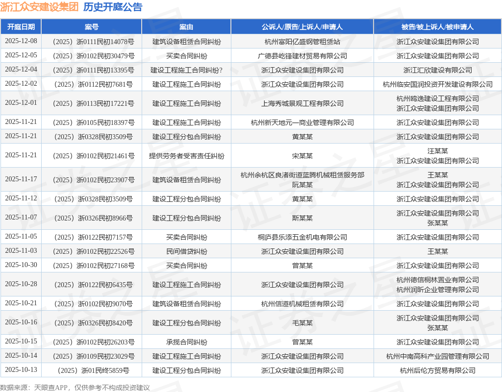 案号:(2025)浙0111民初13395号根据统计,近一年内以浙江众安建设集团有限公司为当事人的历史开庭公告有74则,其中案由为“建设工程分包合同纠纷”的公告以12则居首,其次为“建设工程施工合同纠纷”有11则,“买卖合同纠纷”有10则。历史开庭公告(前20条)如下: