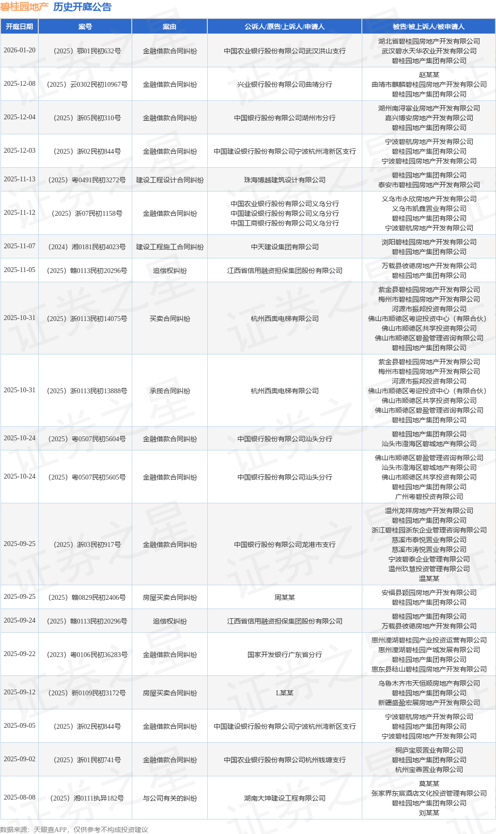 案号:(2025)浙05民初310号根据统计,近一年内以碧桂园地产集团有限公司为当事人的历史开庭公告有106则,其中案由为“金融借款合同纠纷”的公告以50则居首,其次为“建设工程施工合同纠纷”有13则,“股权转让纠纷”有4则。历史开庭公告(前20条)如下: