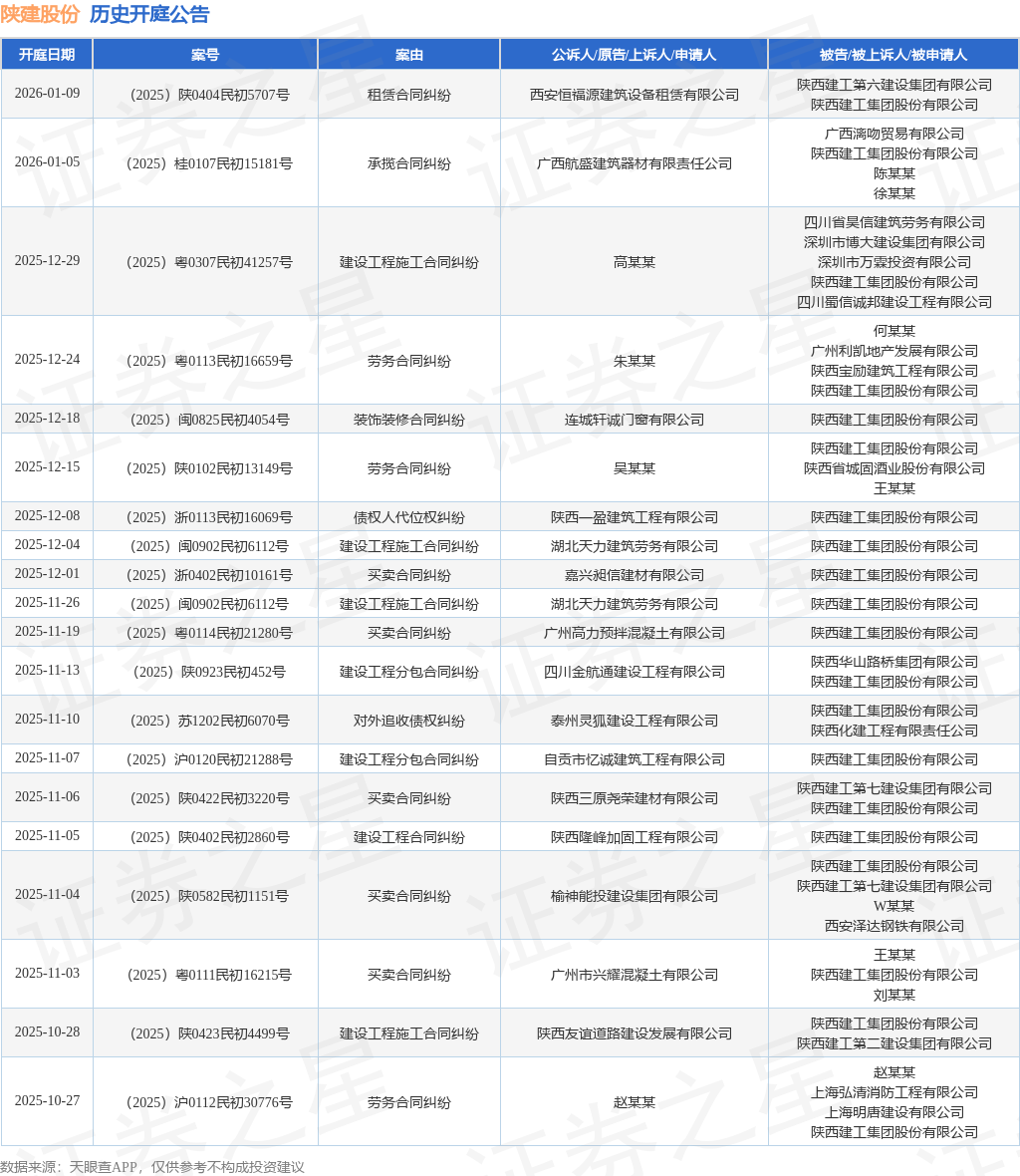 案号:(2025)闽0902民初6112号根据统计,近一年内以陕西建工集团股份有限公司为当事人的历史开庭公告有261则,其中案由为“建设工程施工合同纠纷”的公告以65则居首,其次为“买卖合同纠纷”有50则,“建设工程分包合同纠纷”有32则。历史开庭公告(前20条)如下: