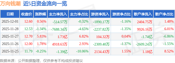 证券之星消息,截至2025年12月1日收盘,万向钱潮(000559)报收于12.6元,上涨0.56%,换手率3.88%,成交量128.69万手,成交额16.29亿元。