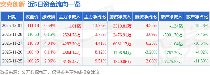 证券之星消息,截至2025年12月1日收盘,安克创新(300866)报收于111.18元,上涨0.59%,换手率2.2%,成交量6.65万手,成交额7.33亿元。