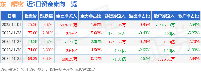 证券之星消息,截至2025年12月1日收盘,东山精密(002384)报收于75.56元,上涨0.67%,换手率3.47%,成交量48.14万手,成交额36.39亿元。