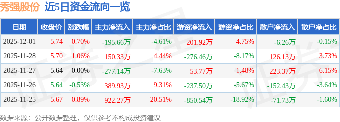 证券之星消息,截至2025年12月1日收盘,秀强股份(300160)报收于5.74元,上涨0.7%,换手率0.97%,成交量7.4万手,成交额4247.87万元。