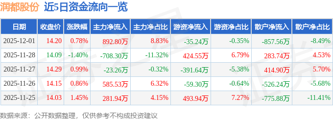 证券之星消息,截至2025年12月1日收盘,润都股份(002923)报收于14.2元,上涨0.78%,换手率2.74%,成交量7.08万手,成交额1.01亿元。