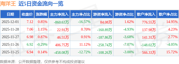 证券之星消息,截至2025年12月1日收盘,海洋王(002724)报收于7.12元,上涨0.85%,换手率1.28%,成交量7.28万手,成交额5193.58万元。