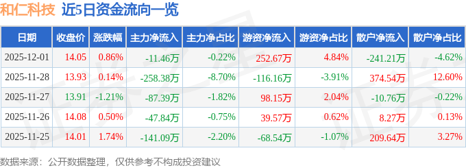 证券之星消息,截至2025年12月1日收盘,和仁科技(300550)报收于14.05元,上涨0.86%,换手率1.4%,成交量3.68万手,成交额5218.67万元。