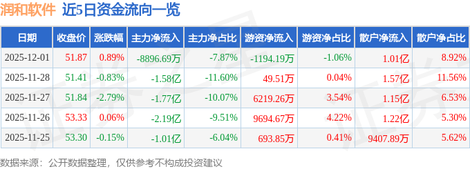 证券之星消息,截至2025年12月1日收盘,润和软件(300339)报收于51.87元,上涨0.89%,换手率2.82%,成交量21.89万手,成交额11.31亿元。