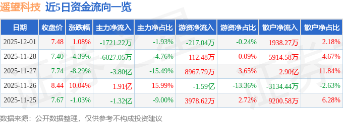 证券之星消息,截至2025年12月1日收盘,遥望科技(002291)报收于7.48元,上涨1.08%,换手率13.82%,成交量120.1万手,成交额8.9亿元。