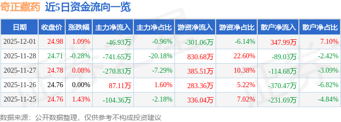 证券之星消息,截至2025年12月1日收盘,奇正藏药(002287)报收于24.98元,上涨1.09%,换手率0.34%,成交量1.96万手,成交额4901.03万元。