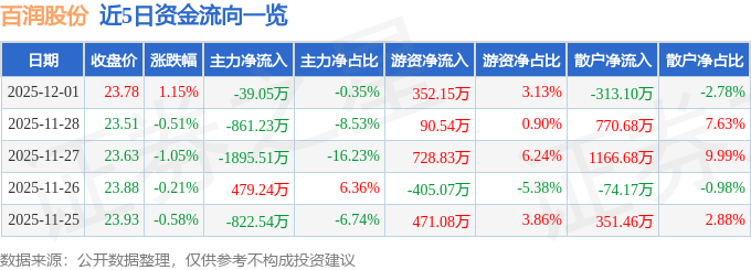 证券之星消息,截至2025年12月1日收盘,百润股份(002568)报收于23.78元,上涨1.15%,换手率0.66%,成交量4.74万手,成交额1.12亿元。