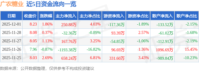 证券之星消息,截至2025年12月1日收盘,广农糖业(000911)报收于8.23元,上涨1.86%,换手率1.9%,成交量7.59万手,成交额6224.22万元。