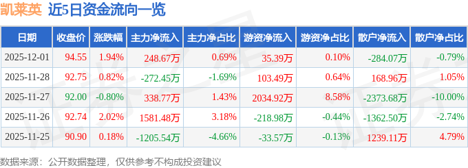 证券之星消息,截至2025年12月1日收盘,凯莱英(002821)报收于94.55元,上涨1.94%,换手率1.21%,成交量3.83万手,成交额3.6亿元。