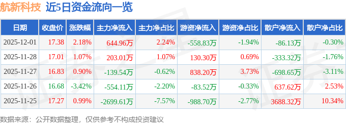 证券之星消息,截至2025年12月1日收盘,航新科技(300424)报收于17.38元,上涨2.18%,换手率6.71%,成交量16.46万手,成交额2.87亿元。