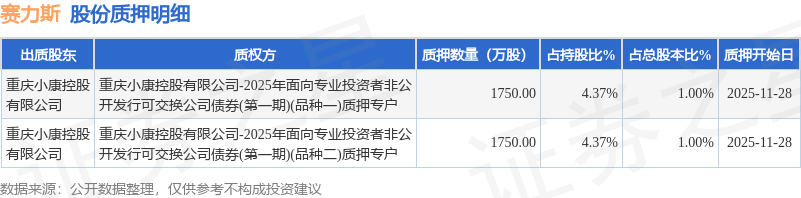 证券之星消息,赛力斯(601127)12月2日公开信息显示,股东重庆小康控股有限公司向重庆小康控股有限公司-2025年面向专业投资者非公开发行可交换公司债券(第一期)(品种一)质押专户、重庆小康控股有限公司-2025年面向专业投资者非公开发行可交换公司债券(第一期)(品种二)质押专户合计质押3500.0万股,占总股本2.01%。质押详情见下表:
