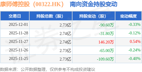 证券之星消息,12月1日南向资金减持90.6万股康师傅控股(00322.HK)。近5个交易日中,获南向资金减持的有4天,累计净减持150.8万股。近20个交易日中,获南向资金减持的有12天,累计净减持141.6万股。截至目前,南向资金持有康师傅控股(00322.HK)2.73亿股,占公司已发行普通股的4.84%。