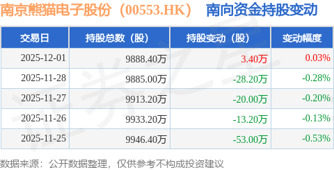 证券之星消息,12月1日南向资金增持3.4万股南京熊猫电子股份(00553.HK)。近5个交易日中,获南向资金减持的有4天,累计净减持111.0万股。近20个交易日中,获南向资金减持的有11天,累计净减持213.2万股。截至目前,南向资金持有南京熊猫电子股份(00553.HK)9888.4万股,占公司已发行普通股的40.85%。