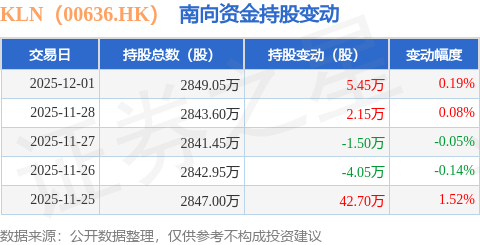 证券之星消息,12月1日南向资金增持5.45万股KLN(00636.HK)。近5个交易日中,获南向资金增持的有3天,累计净增持44.75万股。近20个交易日中,获南向资金增持的有11天,累计净增持83.9万股。截至目前,南向资金持有KLN(00636.HK)2849.05万股,占公司已发行普通股的1.57%。