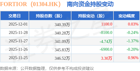 证券之星消息,12月1日南向资金增持1100.0股FORTIOR(01304.HK)。近5个交易日中,获南向资金减持的有3天,累计净减持2.83万股。近20个交易日中,获南向资金增持的有11天,累计净增持15.56万股。截至目前,南向资金持有FORTIOR(01304.HK)340.39万股,占公司已发行普通股的15.79%。