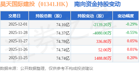 证券之星消息,12月1日南向资金减持2139.2万股昊天国际建投(01341.HK)。近5个交易日中,获南向资金减持的有2天,累计净减持4341.6万股。近20个交易日中,获南向资金增持的有13天,累计净增持17.45亿股。截至目前,南向资金持有昊天国际建投(01341.HK)74.16亿股,占公司已发行普通股的68.36%。