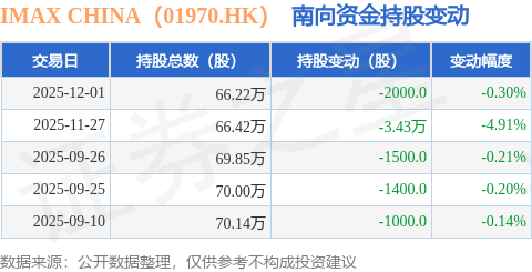 证券之星消息,12月1日南向资金减持2000.0股IMAX CHINA(01970.HK)。近5个交易日中,获南向资金减持的有5天,累计净减持4.02万股。近20个交易日中,获南向资金减持的有20天,累计净减持10.35万股。截至目前,南向资金持有IMAX CHINA(01970.HK)66.22万股,占公司已发行普通股的0.19%。