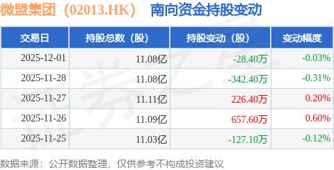 证券之星消息,12月1日南向资金减持28.4万股微盟集团(02013.HK)。近5个交易日中,获南向资金增持的有2天,累计净增持386.1万股。近20个交易日中,获南向资金减持的有12天,累计净减持2990.3万股。截至目前,南向资金持有微盟集团(02013.HK)11.08亿股,占公司已发行普通股的27.96%。