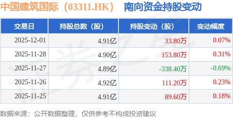 证券之星消息,12月1日南向资金增持33.8万股中国建筑国际(03311.HK)。近5个交易日中,获南向资金增持的有4天,累计净增持50.0万股。近20个交易日中,获南向资金增持的有18天,累计净增持2304.98万股。截至目前,南向资金持有中国建筑国际(03311.HK)4.91亿股,占公司已发行普通股的9.28%。
