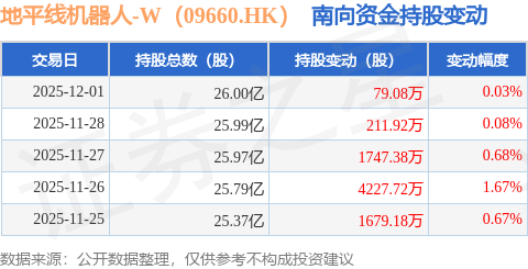 证券之星消息,12月1日南向资金增持79.08万股地平线机器人-W(09660.HK)。近5个交易日中,获南向资金增持的有5天,累计净增持7945.28万股。近20个交易日中,获南向资金增持的有16天,累计净增持2.14亿股。截至目前,南向资金持有地平线机器人-W(09660.HK)26.0亿股,占公司已发行普通股的17.73%。