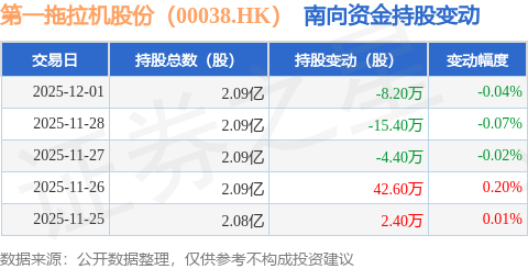 证券之星消息,12月1日南向资金减持8.2万股第一拖拉机股份(00038.HK)。近5个交易日中,获南向资金增持的有2天,累计净增持17.0万股。近20个交易日中,获南向资金增持的有13天,累计净增持351.24万股。截至目前,南向资金持有第一拖拉机股份(00038.HK)2.09亿股,占公司已发行普通股的53.22%。