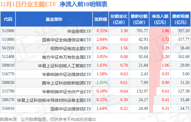 当日有66只行业主题ETF基金出现资金净流入,其中净流入排首位的是华宝券商ETF(512000),份额增加了3.3亿份,净流入额为1.86亿元。