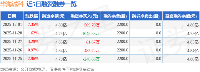 华海诚科融资融券信息显示,融资方面,当日融资买入8352.69万元,融资偿还7842.9万元,融资净买入509.79万元。融券方面,融券卖出0.0股,融券偿还0.0股,融券余量2200.0股,融券余额22.8万元。融资融券余额4.8亿元。