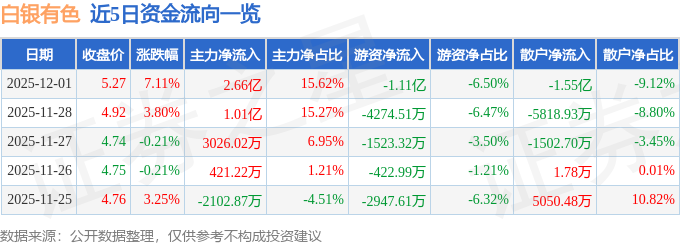 证券之星消息,截至2025年12月1日收盘,白银有色(601212)报收于5.27元,上涨7.11%,换手率4.32%,成交量319.94万手,成交额17.04亿元。