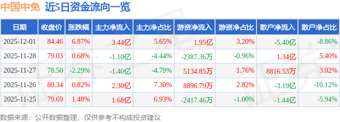 证券之星消息,截至2025年12月1日收盘,中国中免(601888)报收于84.46元,上涨6.87%,换手率3.77%,成交量73.63万手,成交额60.94亿元。