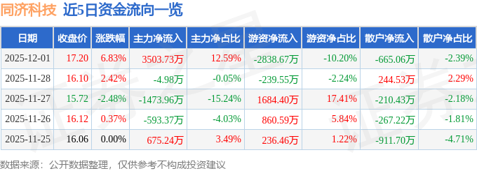 证券之星消息,截至2025年12月1日收盘,同济科技(600846)报收于17.2元,上涨6.83%,换手率2.64%,成交量16.47万手,成交额2.78亿元。