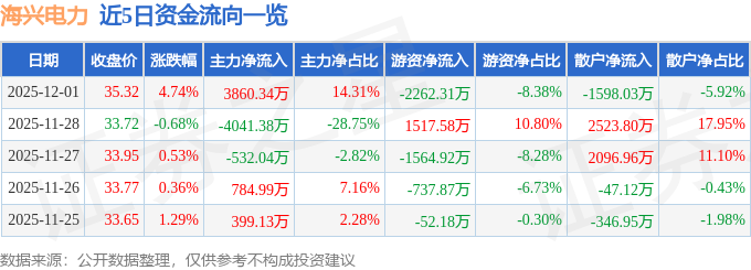 证券之星消息,截至2025年12月1日收盘,海兴电力(603556)报收于35.32元,上涨4.74%,换手率1.59%,成交量7.74万手,成交额2.7亿元。